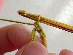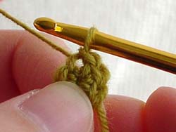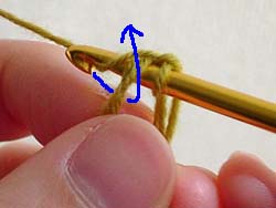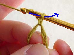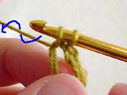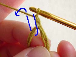 はじめに、立ち上がりのためのくさり編みを1回します。かぎ針に糸をかけて、今かぎ針にかかっている糸の中をくぐらせます。