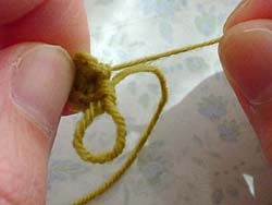 一段目のこま編みを編んで、輪を引っぱって引き締めるまでの作業です。