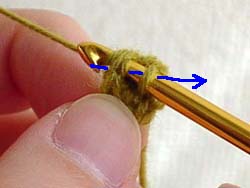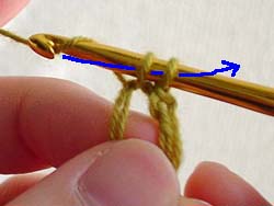 今かぎ針にかかっている糸2本の中から引き出します。