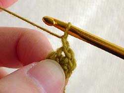 (立ち上がりなしの場合:2段目を編み始めるために、いちばんはじめに編んだこま編みに針を入れたら…)