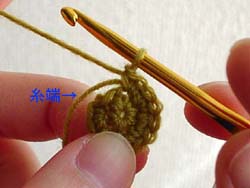 二段目のこま編みを編みながら、編み始めの糸端をくるんで隠してしまいます。